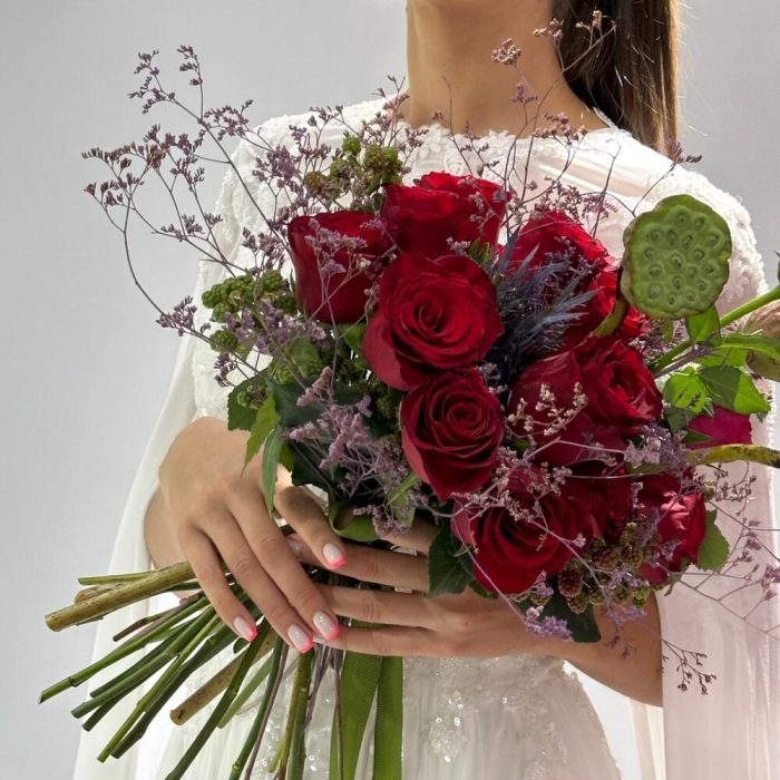 Букет состоит из лотоса и роз. Лотос символизирует чистоту и духовное просветление своими нежными лепестками и уникальной формой, а розы приносят романтику и красоту своими изящными цветами. Это сочетание создает букет, который воплощает гармонию и элегантность, принося радость и восхищение своей утонченностью.