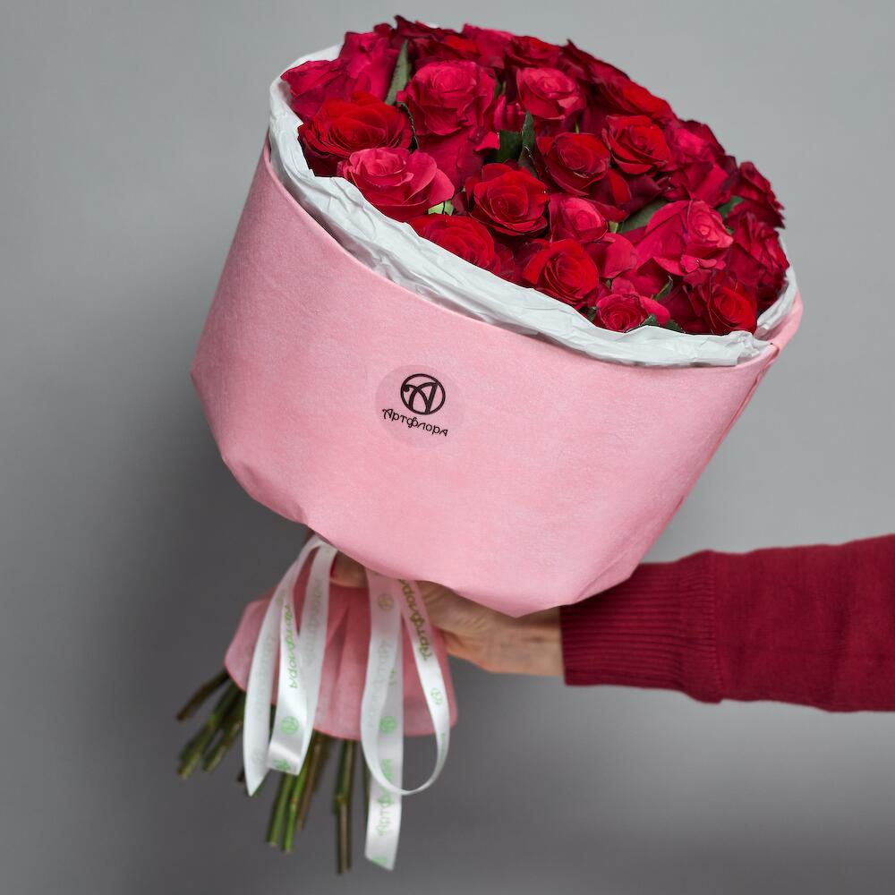 Букет красных роз в розовой упаковке