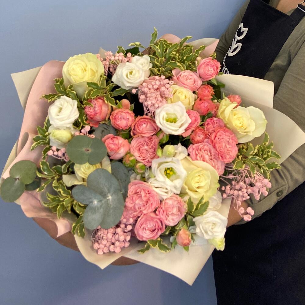 Кустовая пионовидная роза – 3 шт.Роза – 5 шт.Лизиантус – 2 шт.Гипсофила – 1 шт.Зелень – 5 шт.Упаковка дизайнерская – 1 шт.Лента атласная – 1 шт.