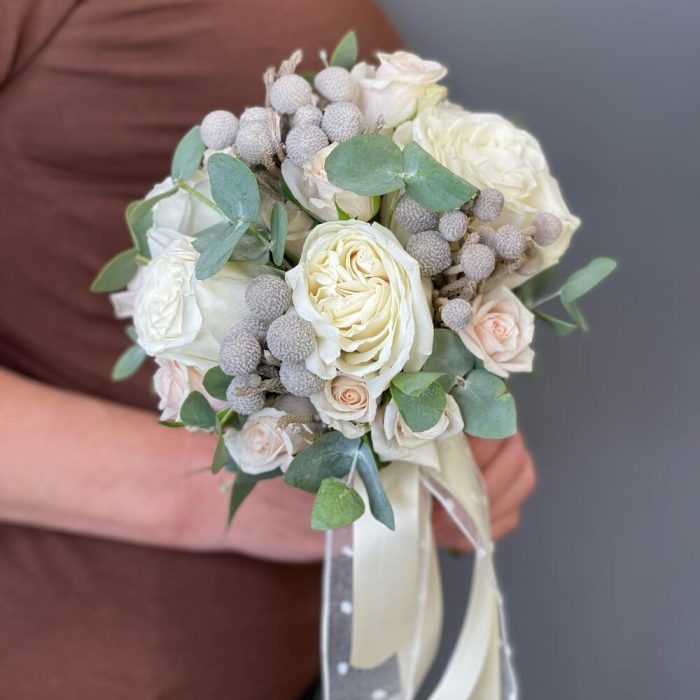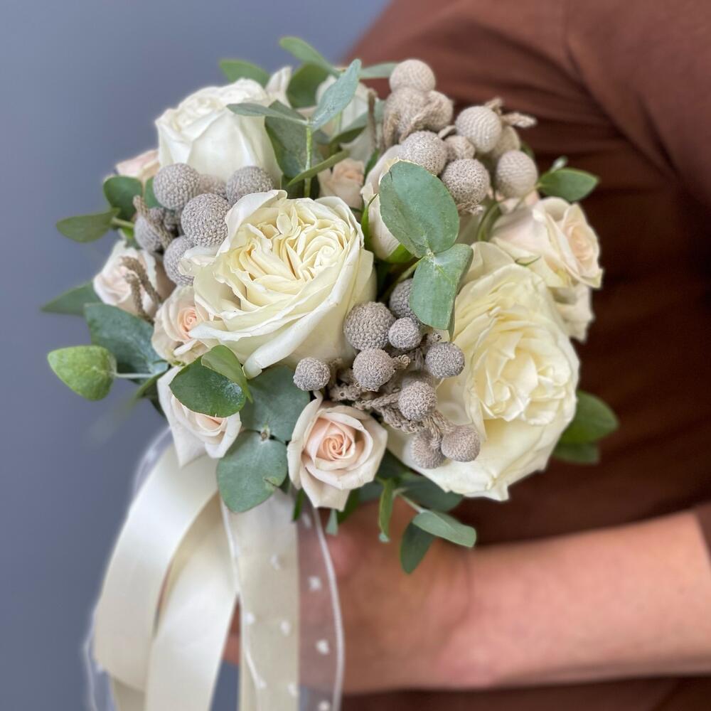 Бруния – 2 шт.Лента – 2 шт.Роза кустовая – 3 шт.Эвкалипт – 2 шт.Роза одноголовая – 5 шт.Транспортировочная коробка – 1 шт.