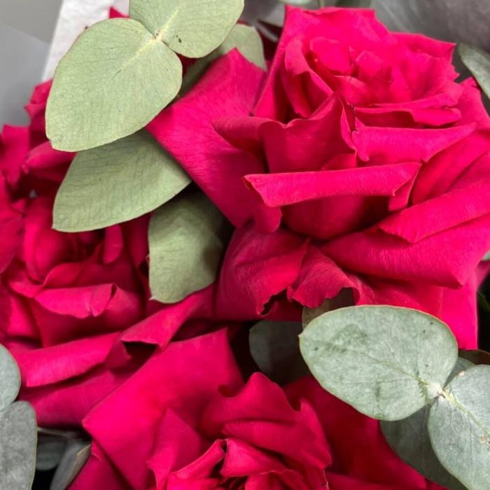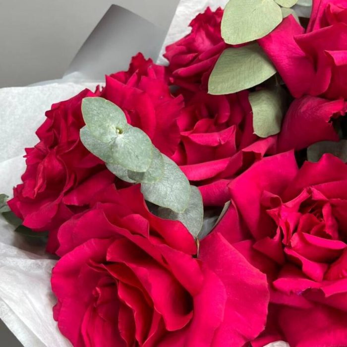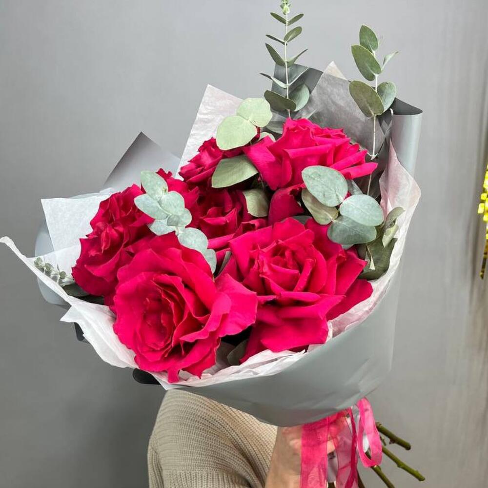 Эвкалипт – 2 шт.Лента атласная – 1 шт.Упаковка дизайнерская – 2 шт.роза gotcha – 5 шт.