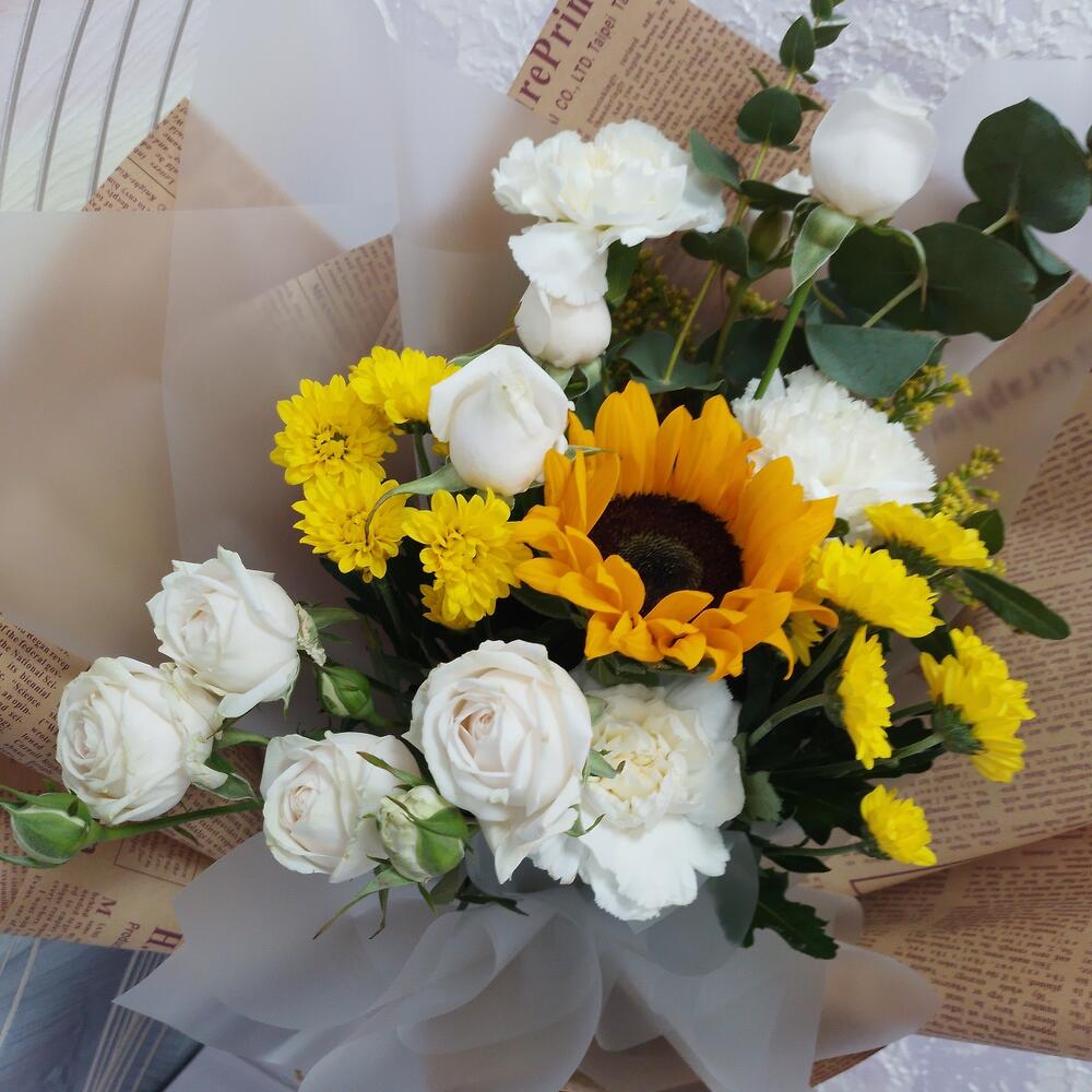 Категорий: Гвоздики, Кустовые розы, Подсолнухи, Розы, Хризантемы