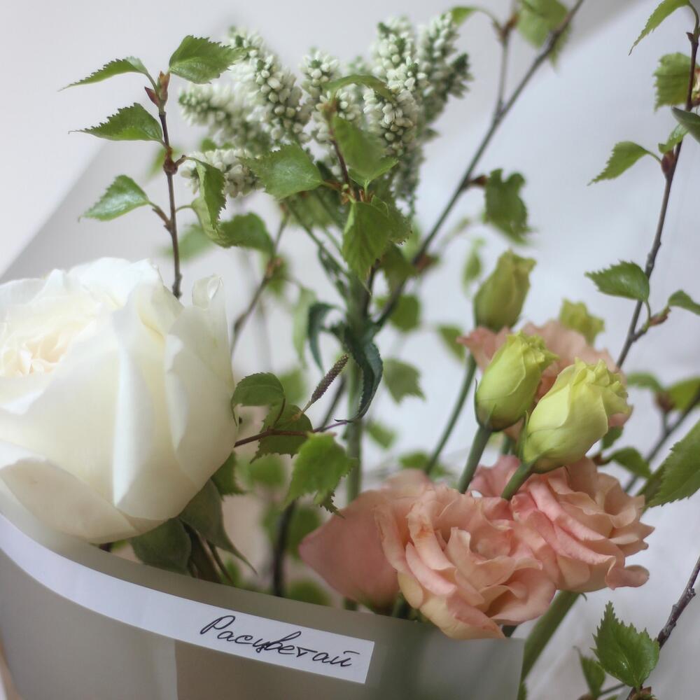 Вероника – 1 шт.Лизиантус – 1 шт.Упаковка дизайнерская – 1 шт.Пион коралл шарм – 1 шт.березовые ветки – 2 шт.Роза – 1 шт.