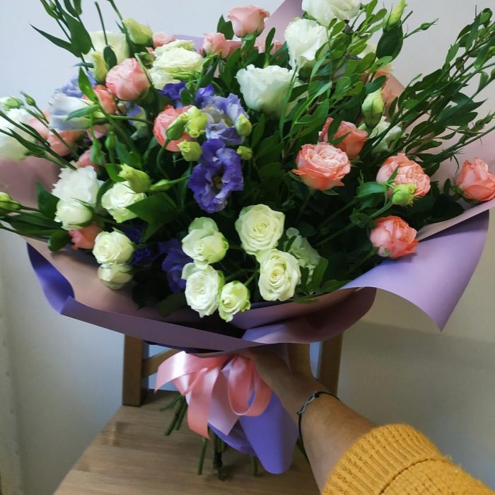 Кустовая роза – 7 шт. эустома белая – 5 шт. эустома синяя – 5 шт. Фисташка – 5 шт. Упаковка дизайнерская – 5 шт. Лента атласная – 1 шт. Пакет подарочный – 1 шт.