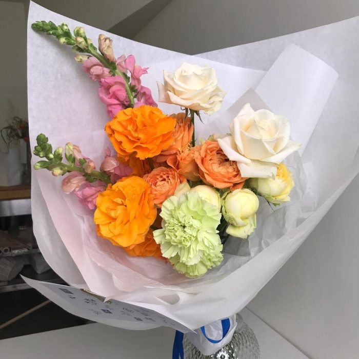 Роза кустовая – 4 шт.Хризантема кустовая – 1 шт.Гвоздика – 2 шт.Роза белая – 2 шт.Роза садовая – 5 шт.антиринум – 2 шт.