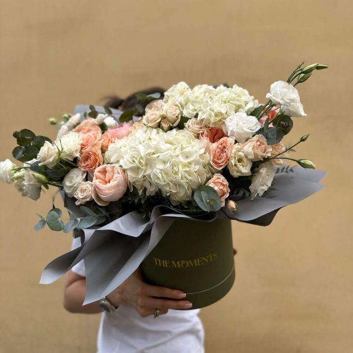 “Атлас☁️” – цветочная композиция с зефиром в деревянном ящике