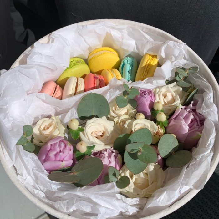 “Атлас☁️” – цветочная композиция с зефиром в деревянном ящике