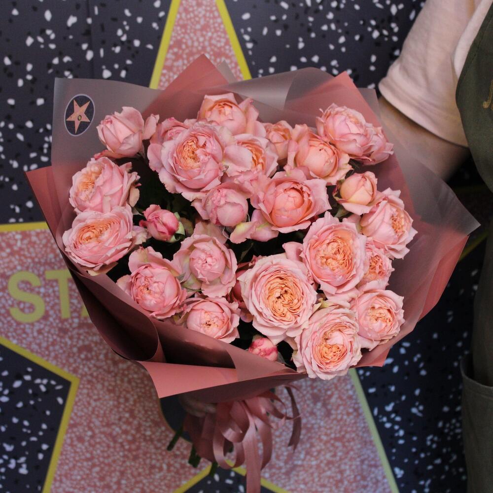 Лента атласная – 1 шт.Пленка дизайнерская – 5 шт.Роза кустовая пионовидная джульетта – 7 шт.