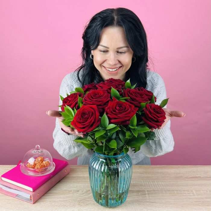 Салал – 10 шт.Ваза – 1 шт.роза одноголовая (красный) – 15 шт.