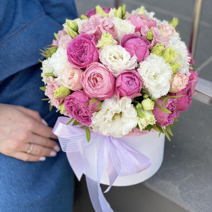 Коробка шляпная – 1 шт. Оазис – 1 шт. Лента – 2 шт. Misty Bubbles пионовидная роза – 3 шт. Сильвия – 2 шт. Бомбастик роза – 1 шт. Писташ – 1 шт. Эустома алиса – 4 шт.