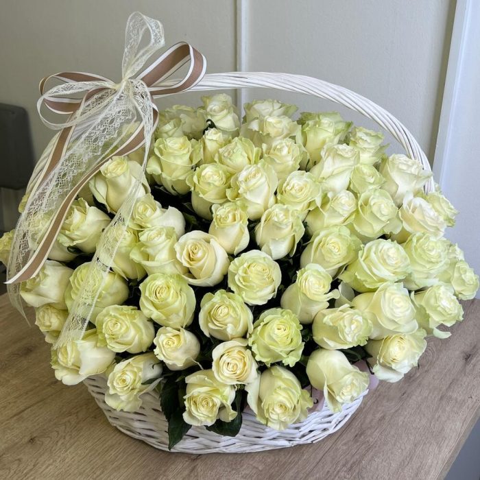 Метки: 101 роза, 14 февраля, Белые розы, от 5000 руб, Роза Роза 40 см, Розы в корзине, цветы в корзине