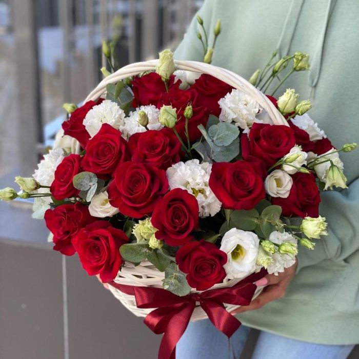 Корзина из красных роз, эустомы и эвкалипта !