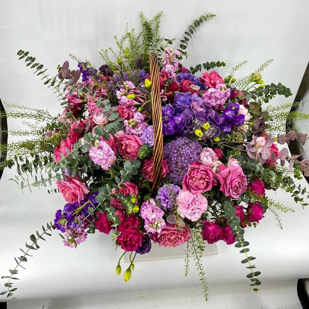 Гортензия – 2 шт.Маттиола – 15 шт.Роза Джульетта – 10 шт.Green bell – 10 шт.Эвкалипт – 10 шт.Аллиум – 1 шт.Гвоздика – 15 шт.