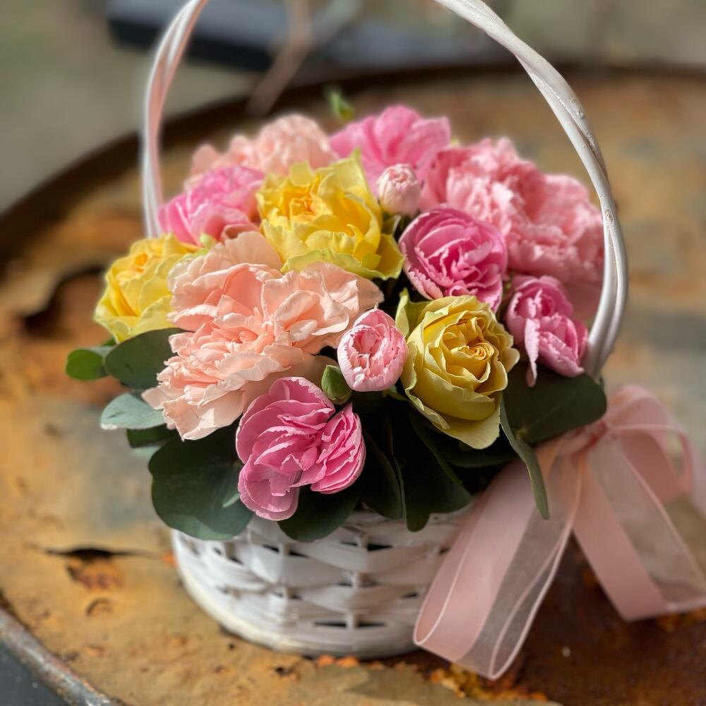 Гвоздика – 3 шт. Гвоздика кустовая – 3 шт. Роза кустовая – 3 шт. Зелень – 1 шт. Корзина плетеная – 1 шт.
