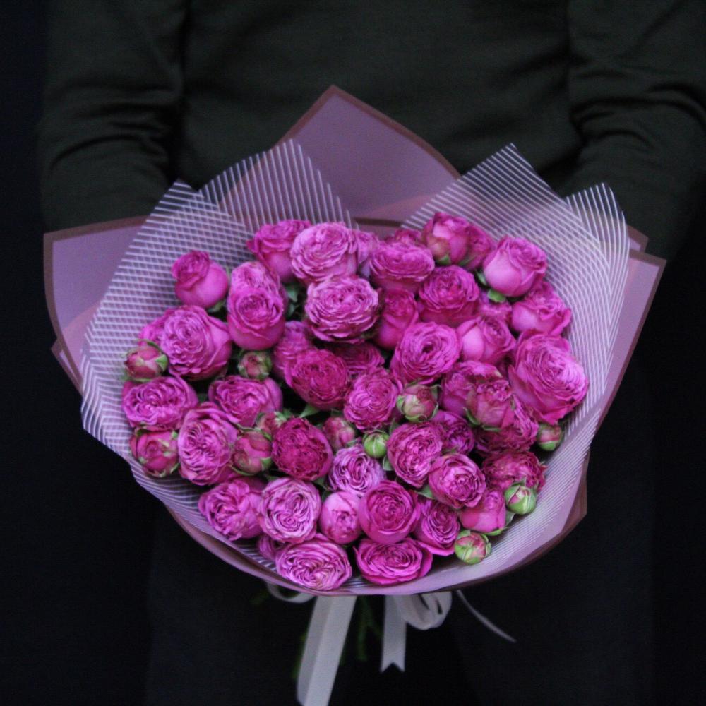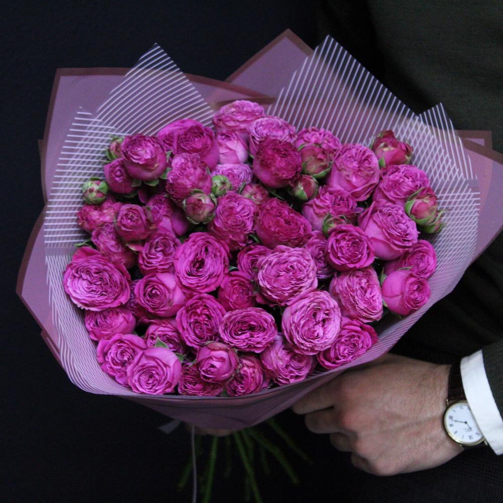Пионовидная кустовая роза – 11 шт.Пленка матовая – 4 шт.Лента атласная – 2 шт.