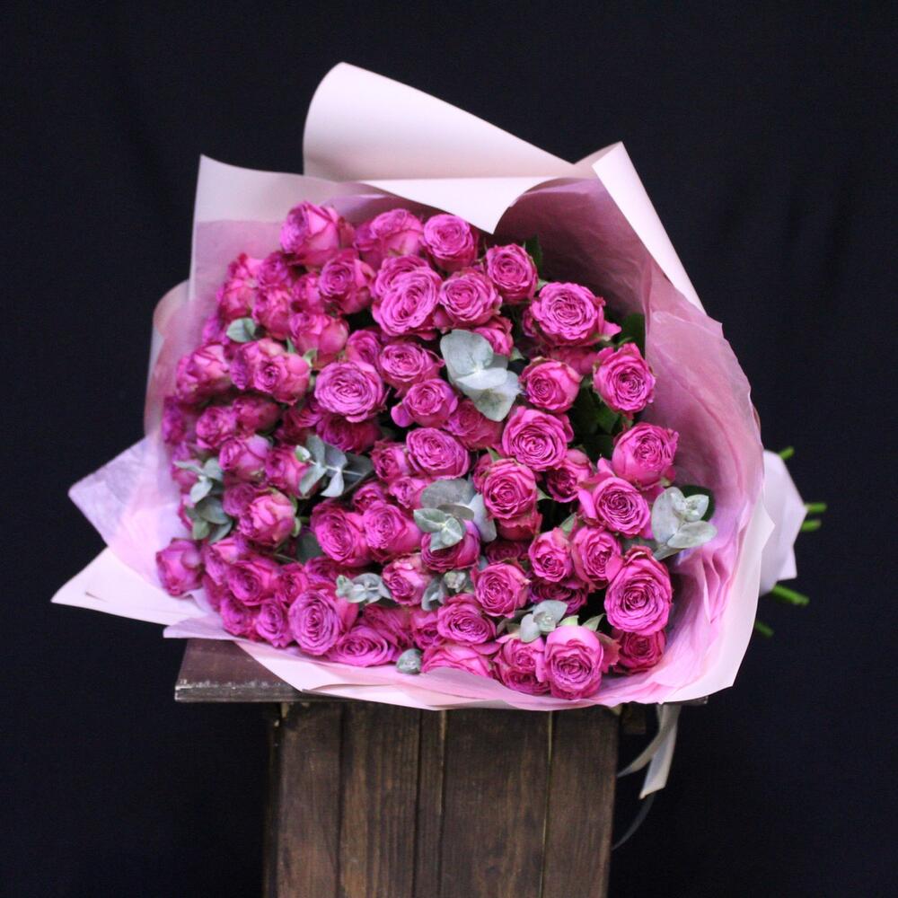 роза кустовая пионовидная классик сенсейшн – 25 шт.Эвкалипт – 5 шт.Пленка дизайнерская – 3 шт.Лента атласная – 1 шт.
