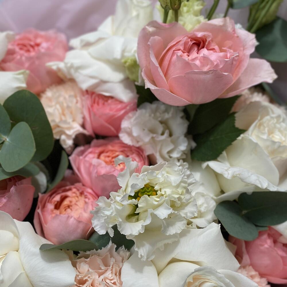 гортензия белая (колумбия) – 1 шт.Роза французская пионовидная – 5 шт.джульетта роза пионовидная – 1 шт.Диантус – 5 шт.Лизиантус Алиса белый – 1 шт.Эвкалипт цинерея – 5 шт.Пистаж – 2 шт.Тишью – 4 шт.Фоамиран (упаковка) – 4 шт.Лента атласная – 2 шт.хризал для срезанных цветов – 1 шт.инструкция по уходу за цветами – 1 шт.