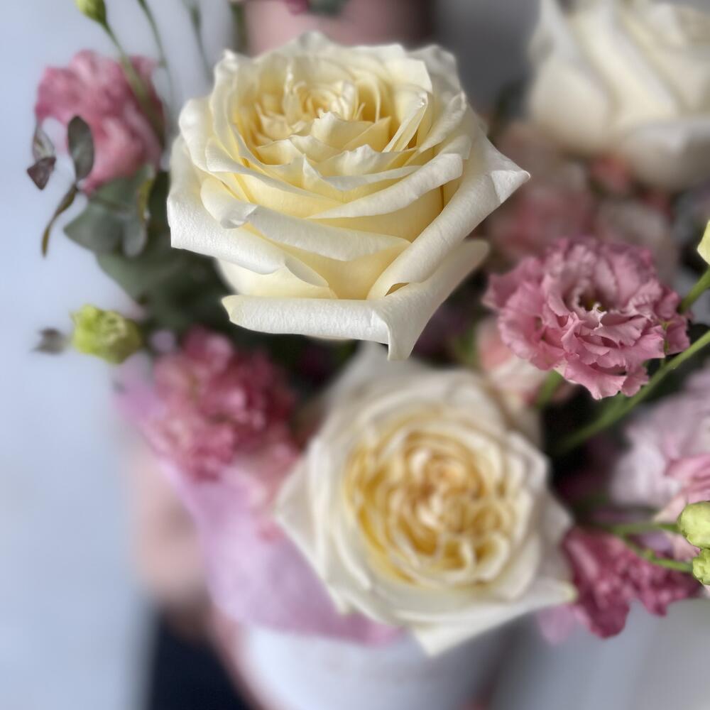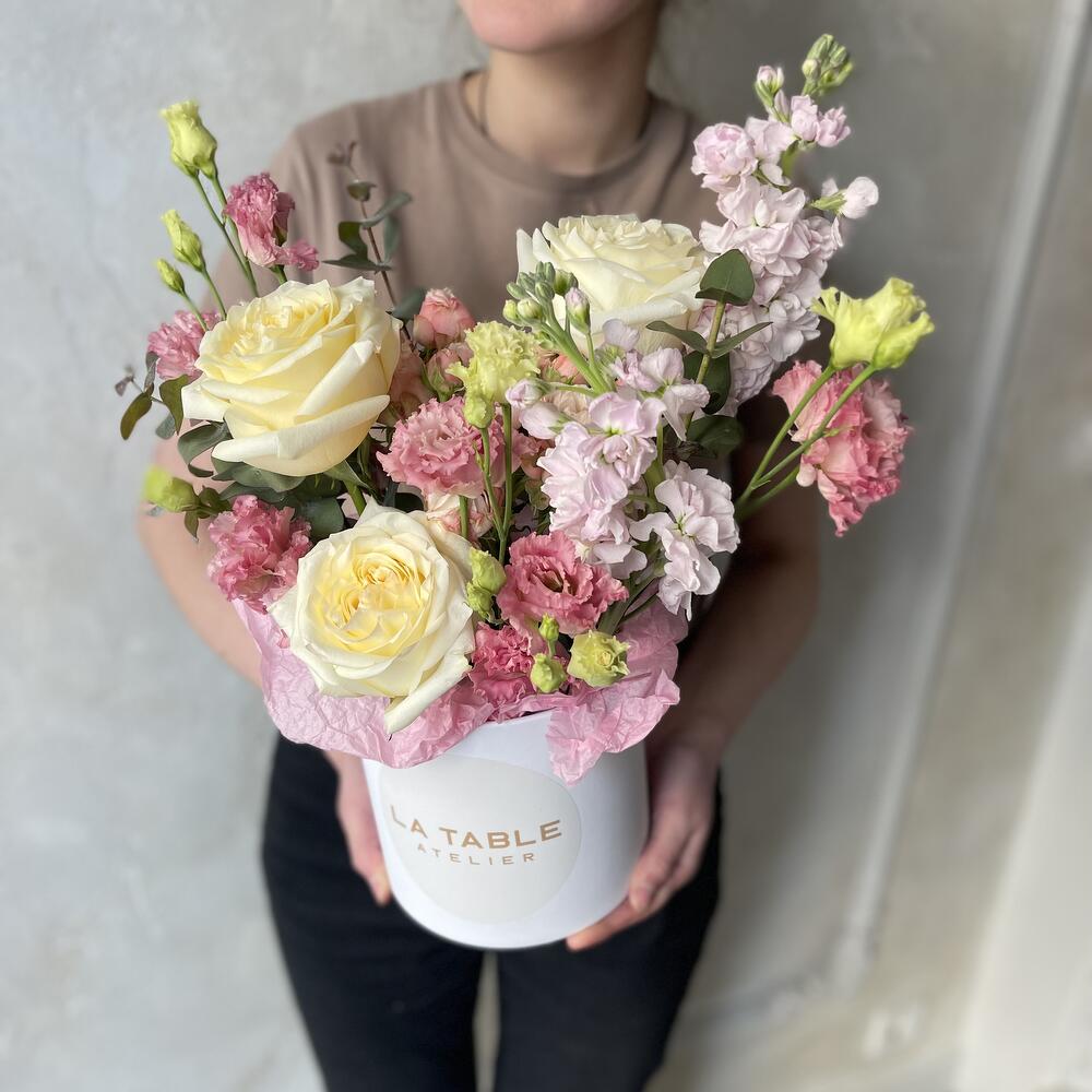 Лизиантус – 1 шт.Маттиола – 2 шт.Эвкалипт – 1 шт.Роза – 4 шт.Шляпная коробка – 1 шт.Оазис флористический – 1 шт.