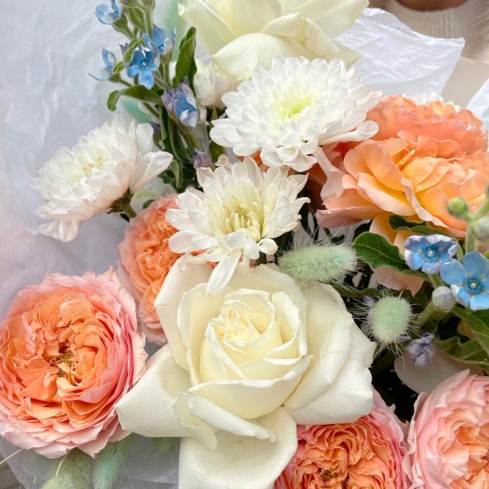 Папоротник – 2 шт.Хризантема кустовая – 3 шт.Лента атласная – 1 шт.Упаковка дизайнерская – 2 шт.Кризал (подкормка) – 1 шт.Аквапак – 1 шт.роза juliet – 4 шт.Транспортировочная коробка – 1 шт.оксипеталум голубой – 4 шт.инструкция по уходу за цветами – 1 шт.роза playa blanca – 5 шт.сухоцвет пучок – 6 шт.