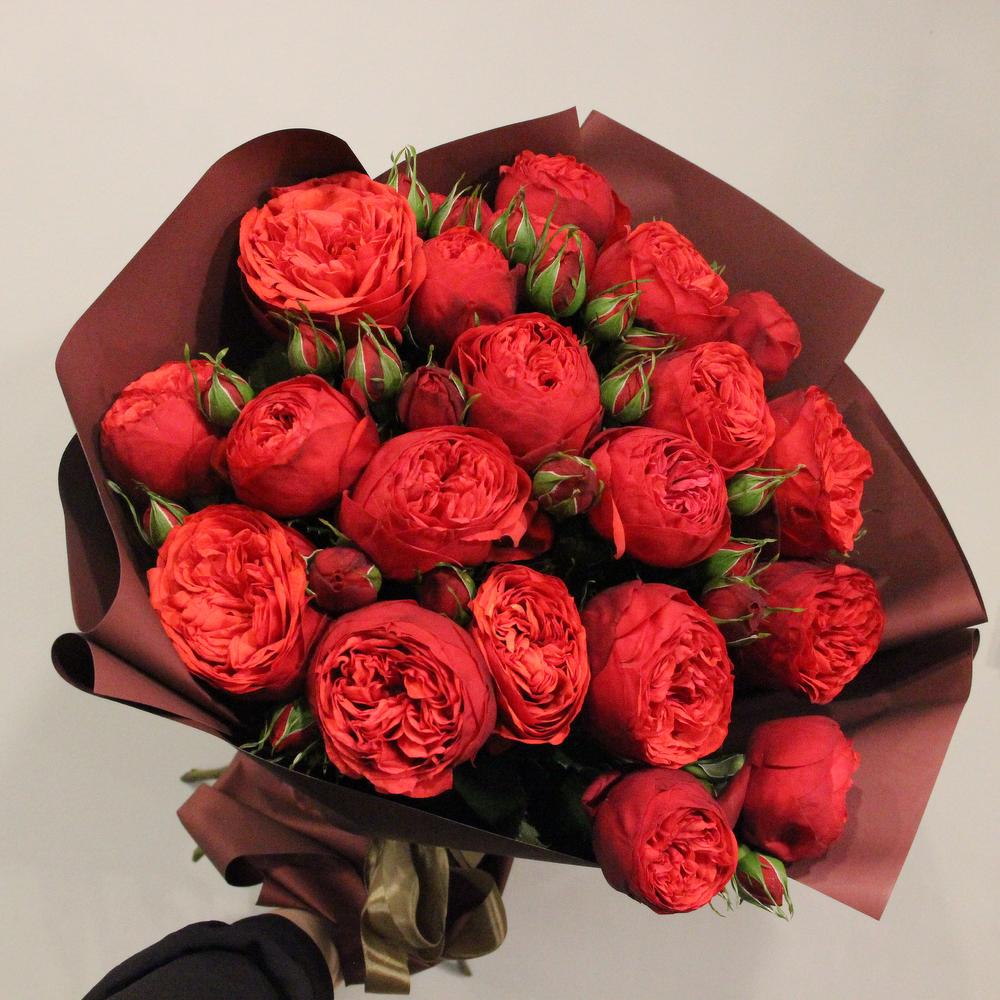 Роза пионовидная Red Piano – 19 шт.Упаковка дизайнерская – 2 шт.Лента атласная – 1 шт.