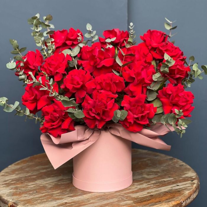 Эвкалипт – 5 шт. Роза Эквадор – 17 шт. Коробка шляпная – 1 шт. Оазис флористический – 1 шт.