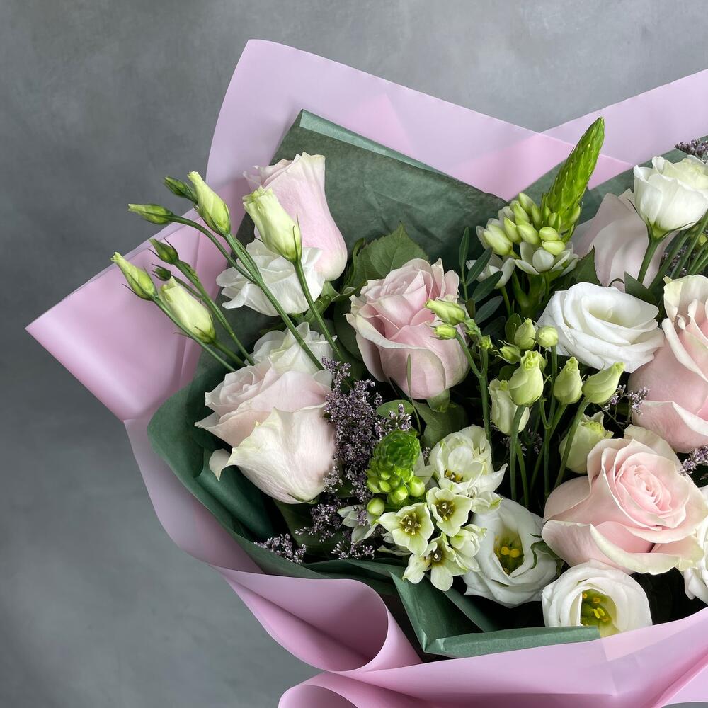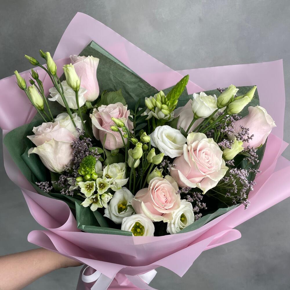 Гвоздики, Лизиантусы, Розы, Тюльпаны