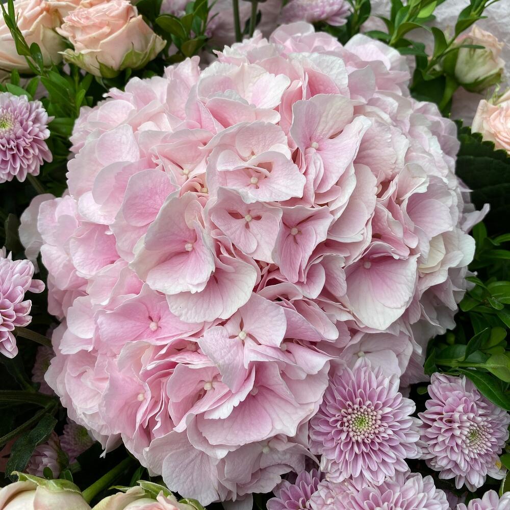 Нежный букет в розовых тонах. Отличное сочетание гортензии и пионовидной розы,с добавлением прекрасной сантини. Легкий воздушный букет станет отличным презентом на любое мероприятие: день рождения,свадьба или же просто коллеге по работе.
