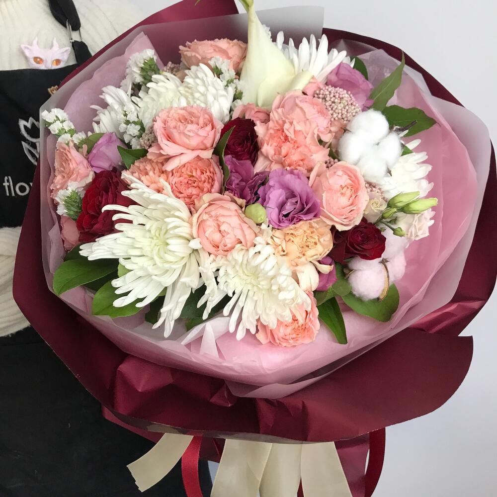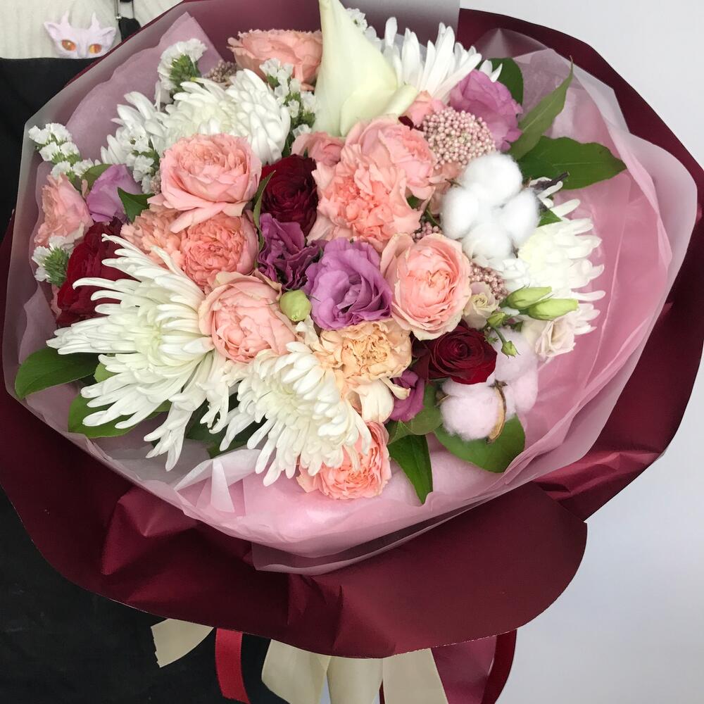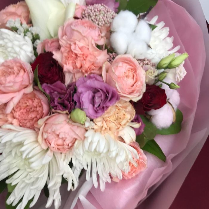 Роза Джульетта – 3 шт.Хризантема – 5 шт.Гвоздика – 5 шт.Эустома – 3 шт.Хлопок – 2 шт.Салал пучок – 1 шт.Роза красная – 5 шт.Калла – 1 шт.Тишью – 2 шт.Пленка дизайнерская – 4 шт.