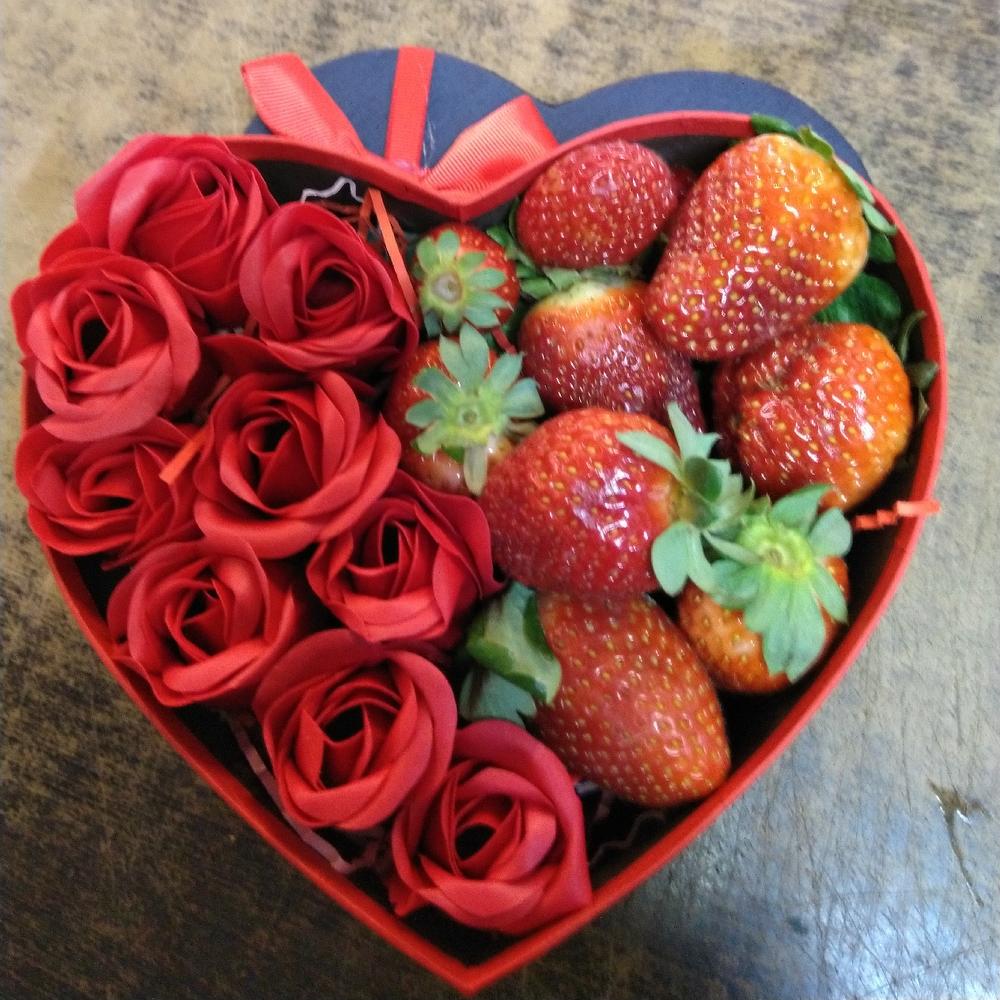 клубника шт – 15 шт.Коробка сердце – 1 шт.Роза – 9 шт.
