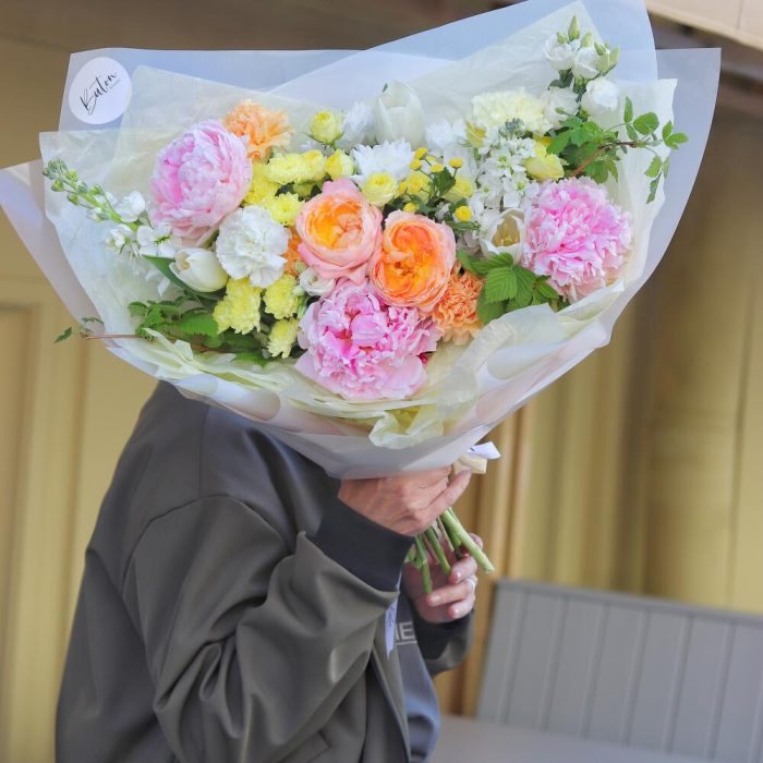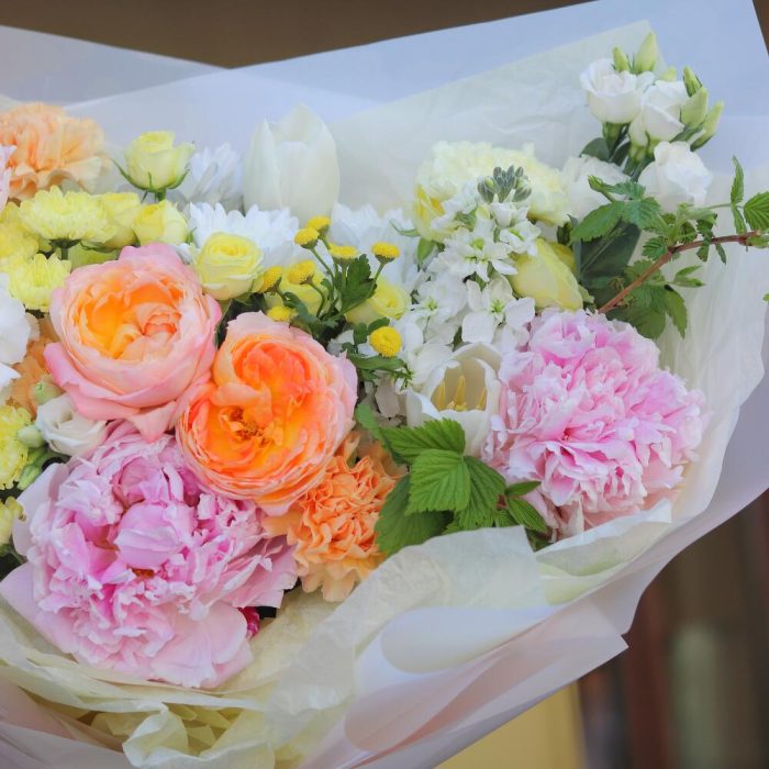 Прекрасный летний букет, созданный из свежайших премиальных цветов: пионов, садовых роз, ароматной маттиолы, лизиантуса, кустовых роз и тюльпанов.Такой букет точно понравится яркой и энергичной получательнице, и будет долго радовать её.К букету прилагается открытка с вашими пожеланиями, инструкцию по уходу за цветами и приятный комплимент от нашего магазина – шоколадка.Мы также будем рады отправить вместе с букетом конфеты, шоколад ручной работы или б/а вино по вашим пожеланиям, просто напишите нам в личные сообщения. Заказывая наш букет, Вы всегда получите исключительный сервис и заботу о клиенте