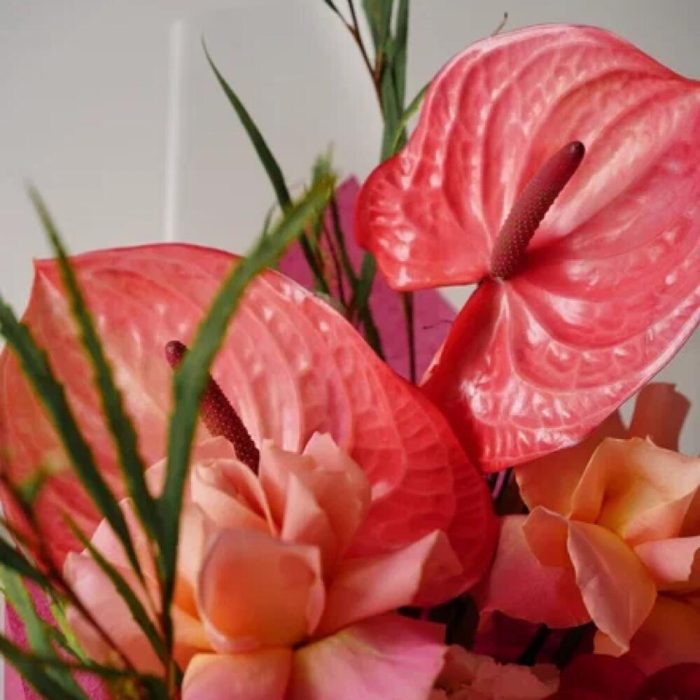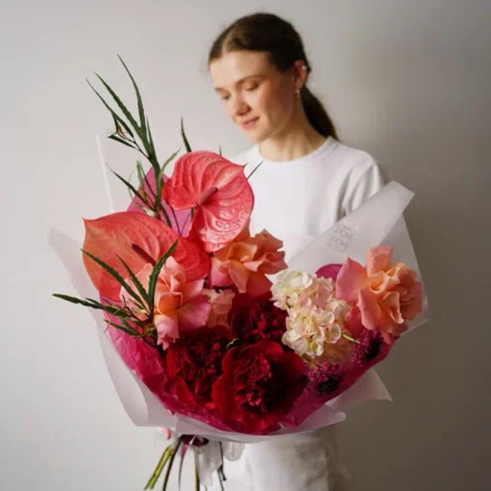 Гортензия – 2 шт.Пион – 3 шт.роза гермоза – 3 шт.Антуриум – 2 шт.гривелия – 3 шт.Скабиоза – 2 шт.