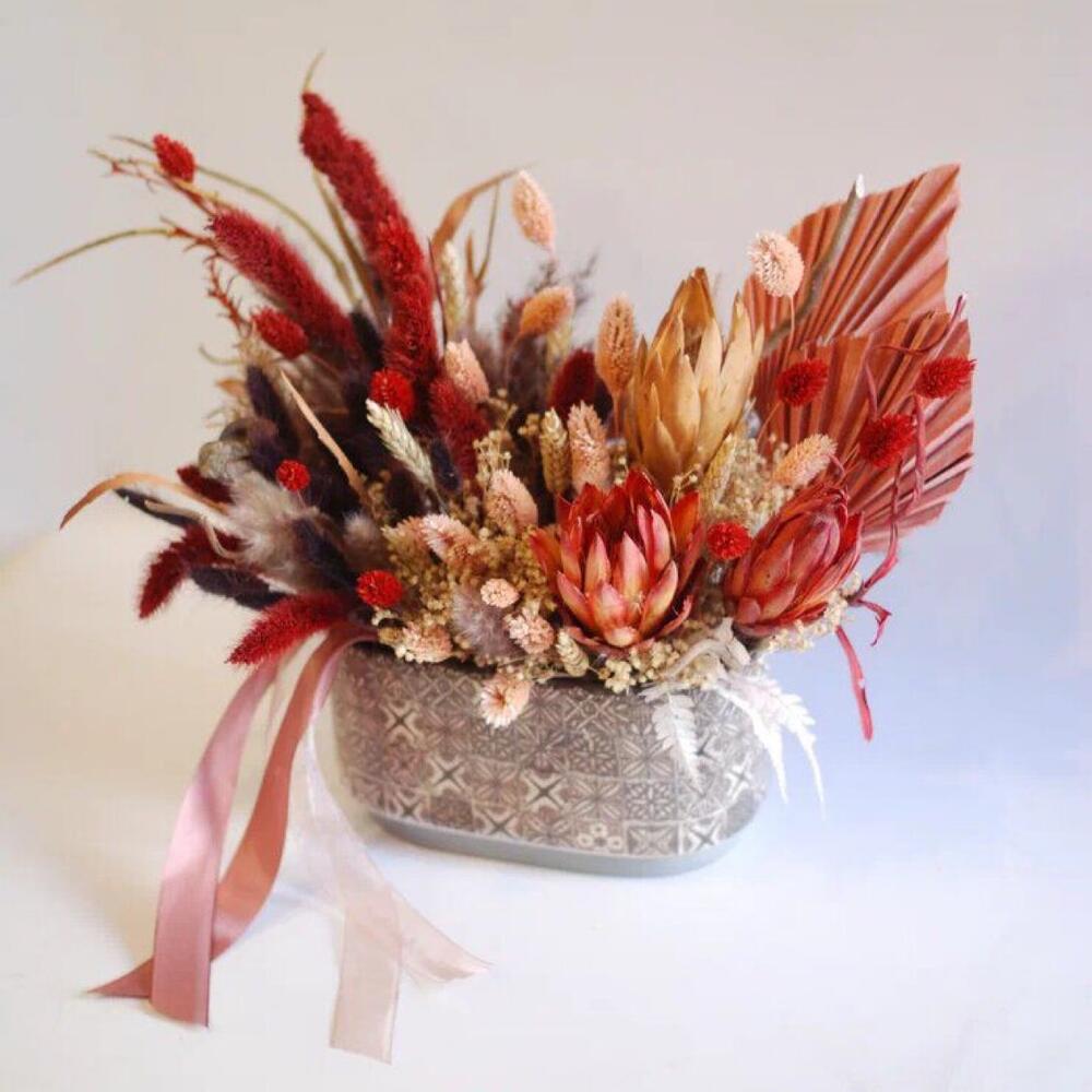 протечку сухоцвет – 3 шт.пальмовое копье – 2 шт.фаларис сухоцвет – 30 шт.Лагурус (сухоцвет) – 50 шт.гривелия – 2 шт.сухоцветы пучок – 15 шт.пшеница колосья – 15 шт.пушистики – 3 шт.ветки декоративные – 2 шт.Кашпо керамическое – 1 шт.