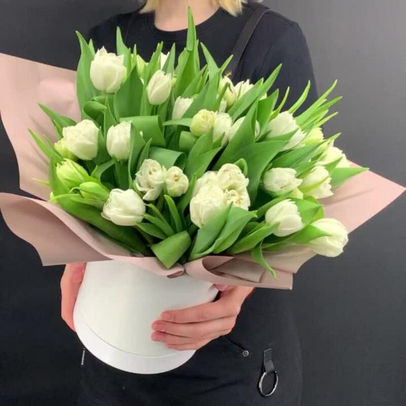 31 белый пионовидный тюльпан в шляпной коробке