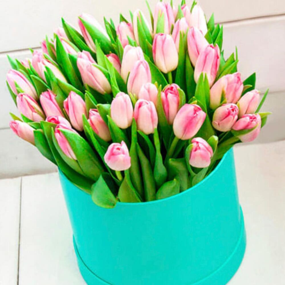 Тюльпан розовый – 51 шт.Оазис флористический – 1 шт.шляпная коробка в ассортименте – 1 шт.